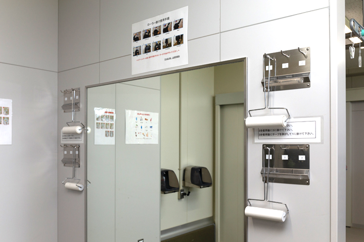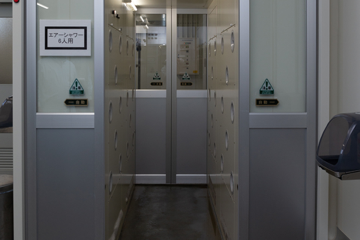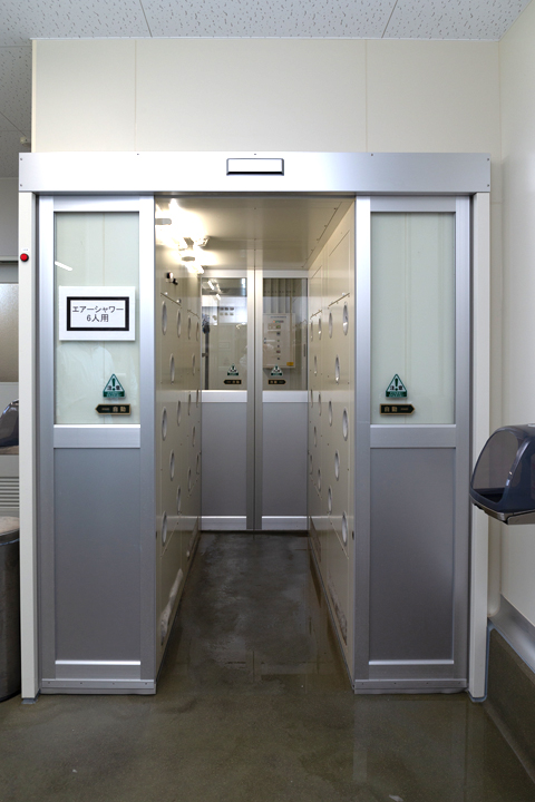 工場への入場時には作業服・帽子・マスク・長靴を着用します。 手洗い、粘着ローラーでの埃の除去、エアーシャワー洗浄、長靴消毒等を行うことで、衛生の管理を徹底しています。